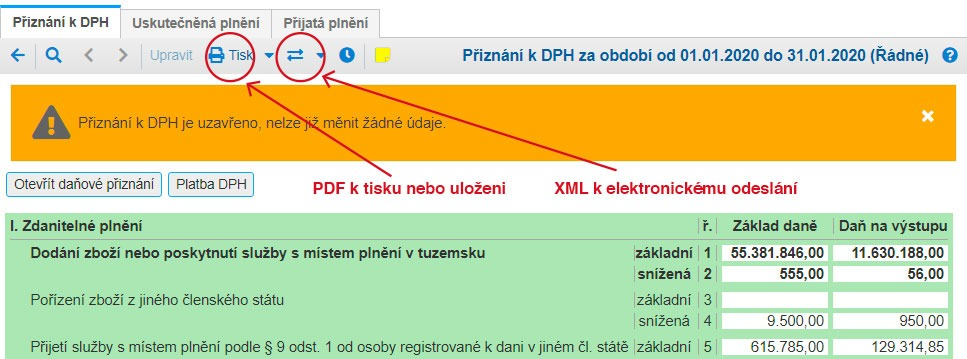 Vygenerované DPH přiznání a hlášení máte připraveny ke kontrole (viz další krok). Pro tisk nebo export DPH přiznání, kontrolního a souhrnného hlášení, je nutné DPH přiznání uzavřít. Kliknutím na tlačítko Uzavřít DPH přiznání budete mít k dispozici příslušné DPH přiznání, kontrolní i souhrnné hlášení v PDF i XML formátu. Kontrolní a souhrnné hlášení máte k dispozici pouze po uzavření DPH přiznání.