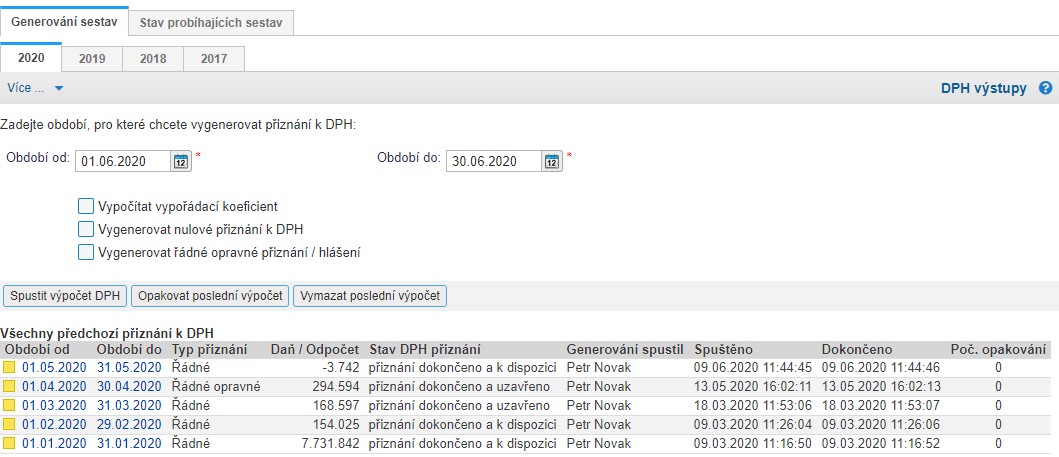 Vyberte si příslušné zdaňovací období, měsíční nebo čtvrtletní (v případě čtvrtletního zdaň. období, zde zvolte celé čtvrtletí, tzn. 1Q = 1.1. až 31.3.) a klikněte na Spustit. Po dokončení procesu generování se vraťte zpět do záložky Generování sestav, kde bude vygenerováné přiznání zobrazeno v seznamu (kontrola data a času, či uživatele).
