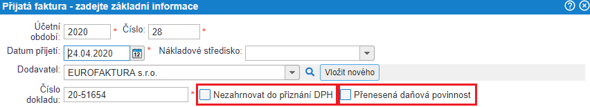Pokud přijatá faktura vykazuje znaky přenesení daňové povinnosti (PDP), musíme takovou fakturu patřičně označit v hlavičce při její tvorbě.