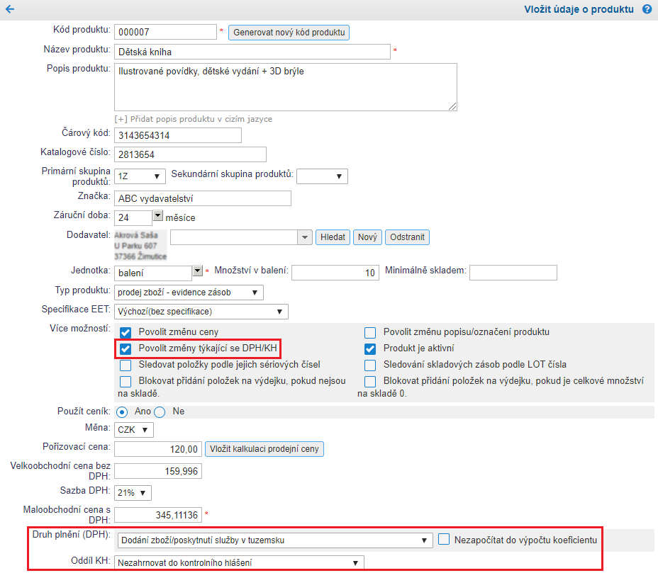 Prodáváte-li produkty pouze v rámci ČR, nic dalšího není nutné na produktu nastavit. Pokud prodáváte i do zahraničí a proto potřebujete dle povahy prodeje měnit druh plnění DPH i oddíl KH, pak u daného produktu zatrhněte možnost Povolit změny týkající se DPH/KH. Při tvorbě faktury si tak budete moci nastavit Druh plnění DPH i oddíl KH podle potřeby u každé položky zvlášť.