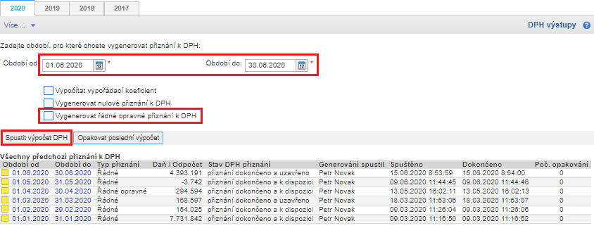Upravte doklady, nebo přidejte chybějící a poté v přehledu daňových přiznání vyberte příslušné období a možnost Vygenerovat řádné opravné přiznání k DPH a klikněte na Spustit výpočet. Pro kontrolu a odeslání opravného DPH přiznání postupujte dle výše popsaných bodů.
