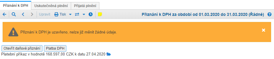 V případě, že potřebujete upravit nebo odstranit přiznání k DPH je nutné jej nejdřív otevřít. Teprve poté vám systém dovolí poslední DPH přiznání v řadě smazat. Dřívější DPH přiznání odstranit nelze.