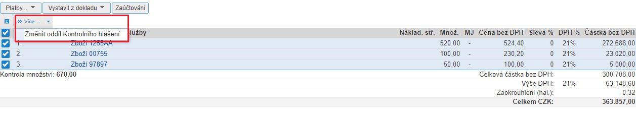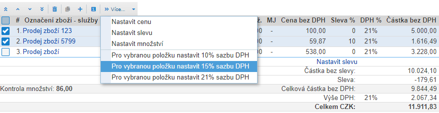 TIP: Na vybraných položkách můžete rovněž hromadně změnit sazbu DPH. Označte požadované položky a kliknutím na “Více” zvolíte příslušnou volbu.