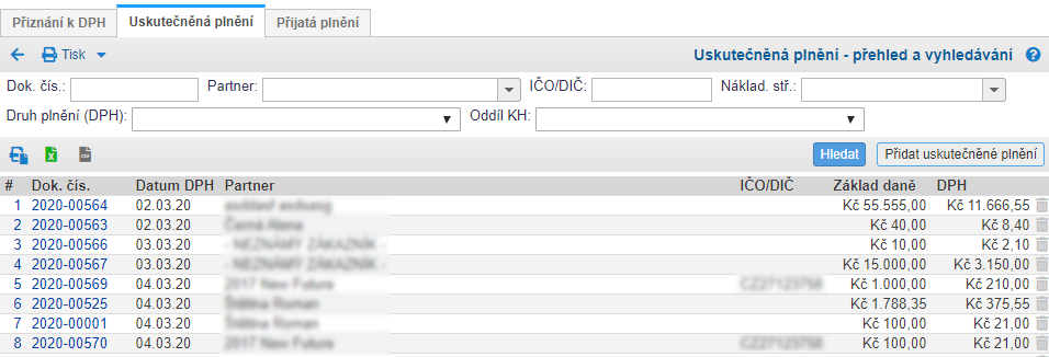 V této fázi máte připravena všechna hlášení i podklady ke kontrole. Záložky Uskutečněná plnění a Přijatá plnění obsahují seznam všech dokladů, které vstupují do DPH přiznání za dané zdaňovací období. Slouží k jejich jednoduchému přehledu a prověření. K dispozici jsou i filtry pro vyhledávání dokladů – např. dle partnera, druhu plnění (DPH), oddílu KH.